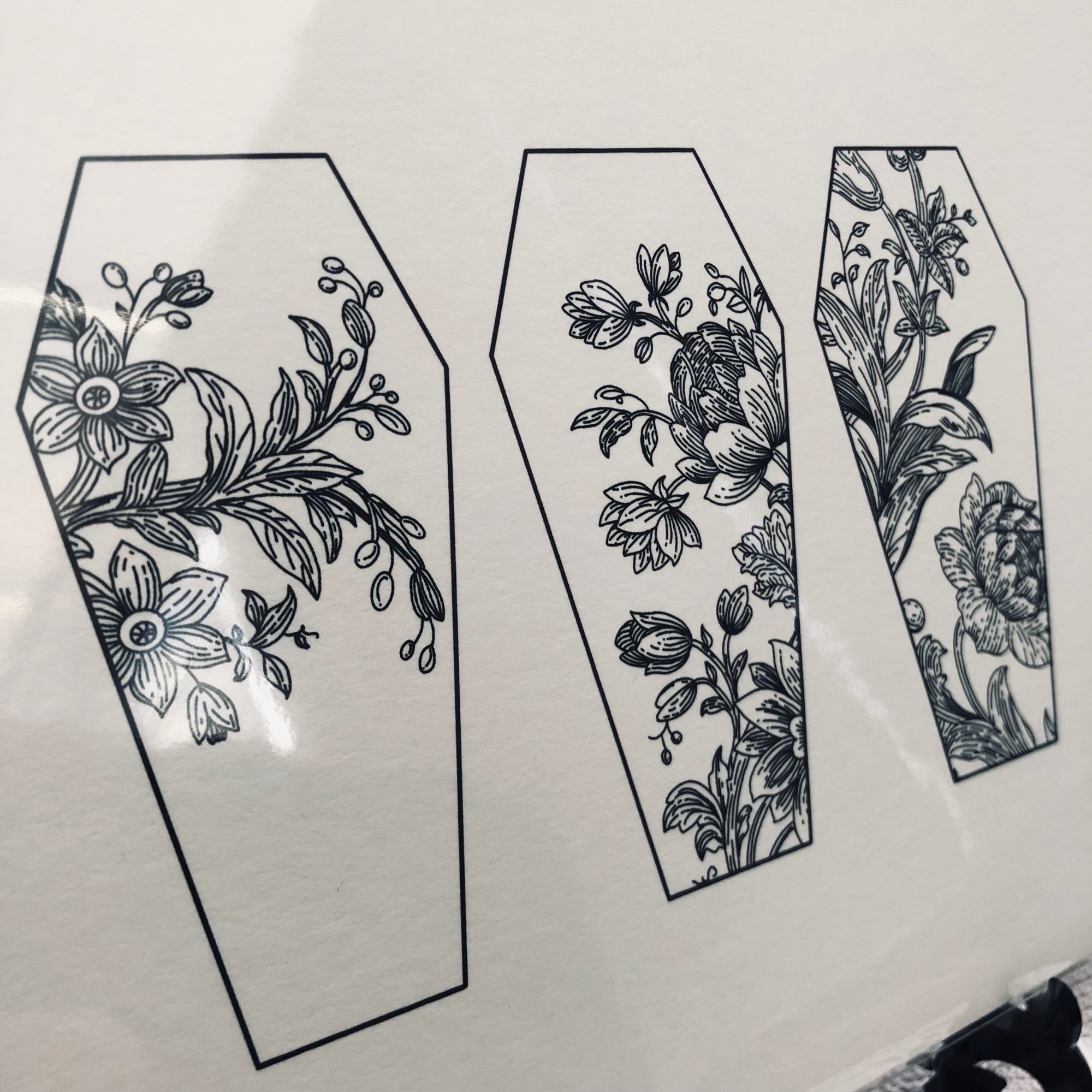 Beautiful gothic coffin framed outline bouquet series illustration.